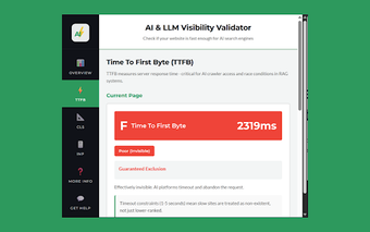 AI & LLM Visibility Validator är ett tillägg för Chrome som hjälper webbplatsägare att bedöma och förbättra sina sidor för att säkerställa synlighet på AI-chatbots och LLMs. Med funktioner som omedelbar TTFB-analys och AI-synlighetsbetyg, ger verktyget en tydlig översikt över hur snabbt en webbplats svarar. Det analyserar både individuella sidor och hela webbplatsers prestanda, vilket är avgörande för att undvika att bli osynlig för AI-system.